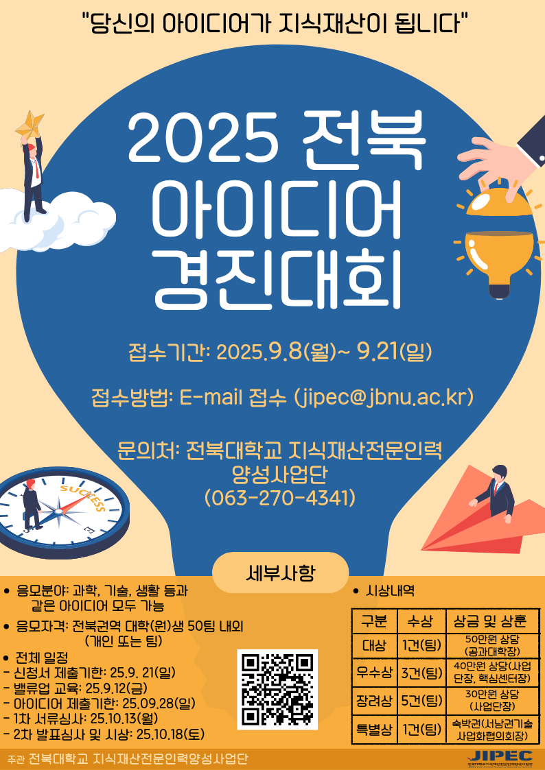공지사항 2025 전북 아이디어 경진대회 참가자 모집(~09.21) 기간연장 관리자2025-09-09조회 375 2025 전북 아이디어 경진대회 계획(안).hwp (393.0 KB) 목록보기 윗글 국정원 판교캠퍼스(국가사이버안보센터) 현장학습 참가자 모집 아랫글 지식재산 부전공 신청자 모집(08.04.(월)~08.08.(금))