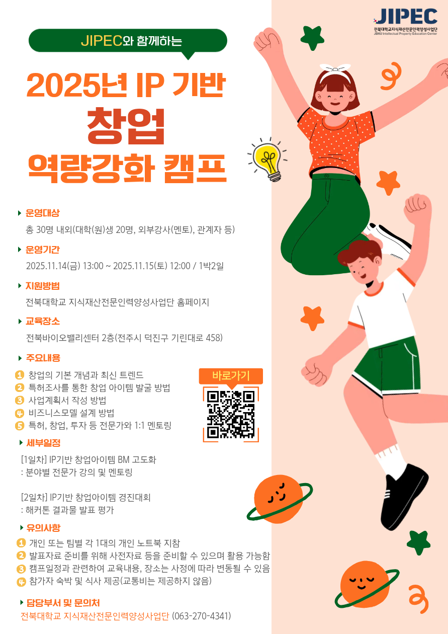 전북대학교 지식재산전문인력양성사업단에서는 지식재산에 관심 학생의 역량강화를 위하여 2025 IP기반 창업 역량강화 캠프 운영하고자 합니다.